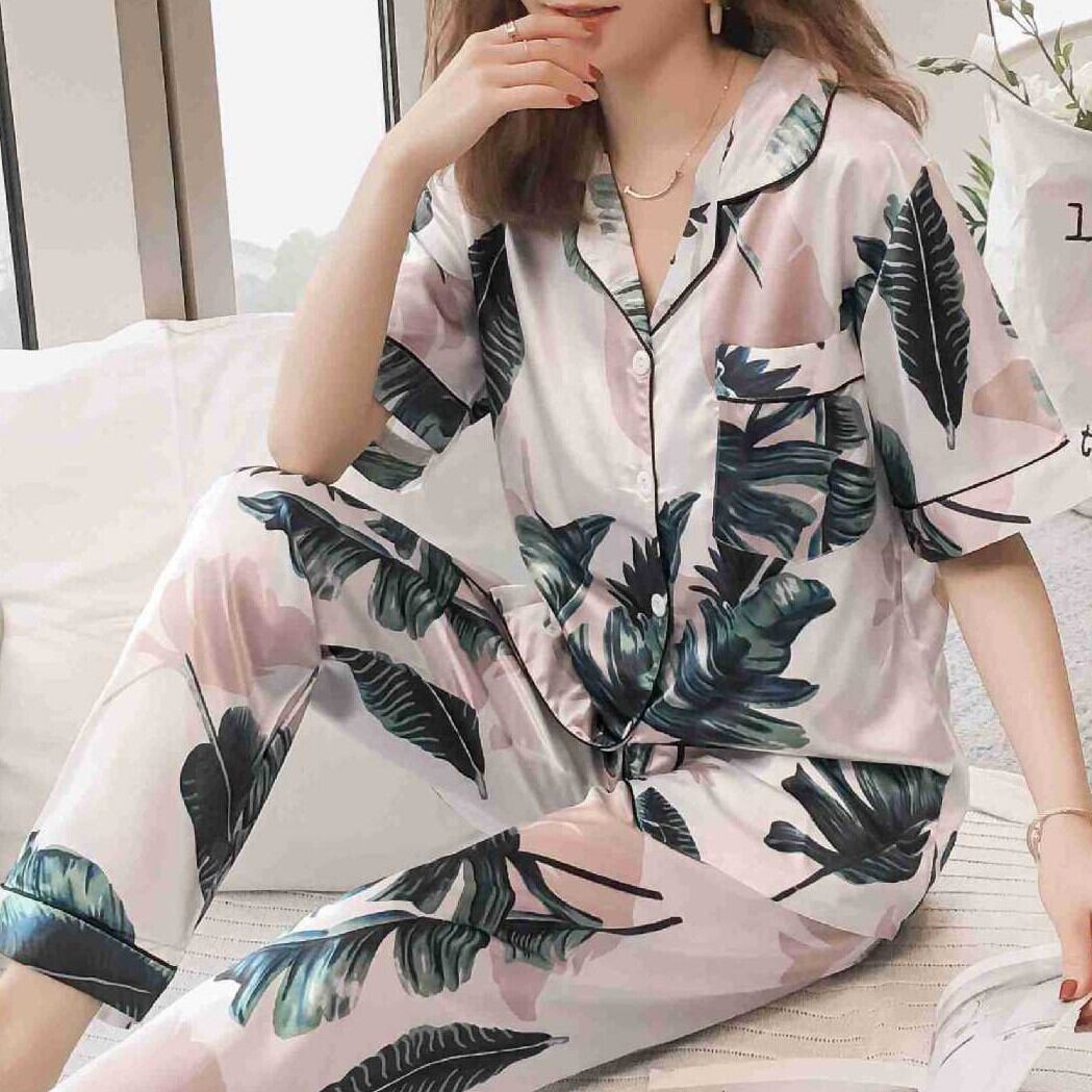 ストライプ ピンク サテン シルク風 半袖 上下 セットアップ ルームウェア パジャマ7314802